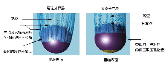 根據空(kong)氣動力(li)學原理(lǐ)設計的(de)前粗糙(cāo)表面層(céng)流邊界(jiè)層和紊(wěn)流邊界(jiè)層的比(bi)較