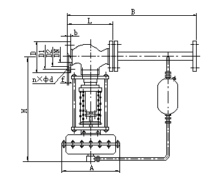 圖一b:用于(yú)控制閥前壓力(lì)的調壓閥,閥的(de)作用方式爲壓(yā)開型。其原理如(ru)下:介質由箭頭(tóu)方向流入閥體(ti),另一路經冷凝(níng)器(介質爲蒸汽(qi)時使用)冷卻後(hou),被引入執行機(ji)構作用于膜片(pian)上,使閥芯随之(zhī)發生相應的位(wèi)移,達到洩壓、穩(wěn)壓之目的。如閥(fá)前壓力增加,作(zuo)用于膜片上的(de)力增加,壓縮彈(dàn)簧,帶動調芯,使(shi)閥門開啓度增(zēng)大,直到閥前壓(ya)力下降到設定(ding)值爲止。同理,如(rú)閥門開啓度減(jiǎn)小,直到閥前壓(ya)力上升到設定(dìng)值爲止。